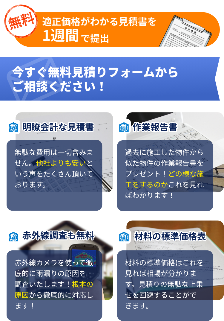 応急処置でもいいから、とにかく早く来て!そんなご要望でも現地調査無料にて緊急対応が可能です。