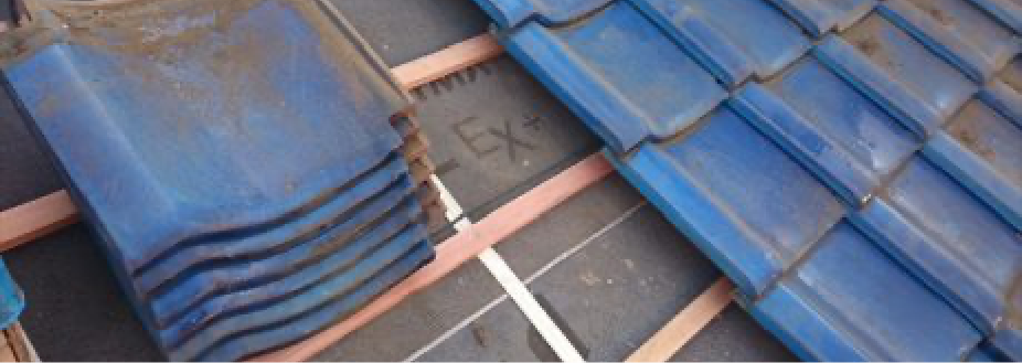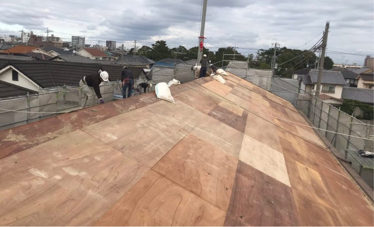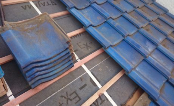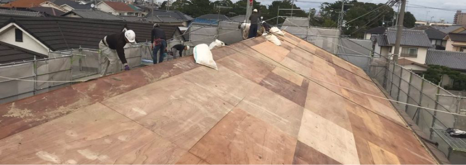 表面の瓦を一度取り外したあと、屋根の下地である「防水シート(ルーフィング)」「下地木材(野地板)」を交換・補修し、元の瓦を敷き直します。